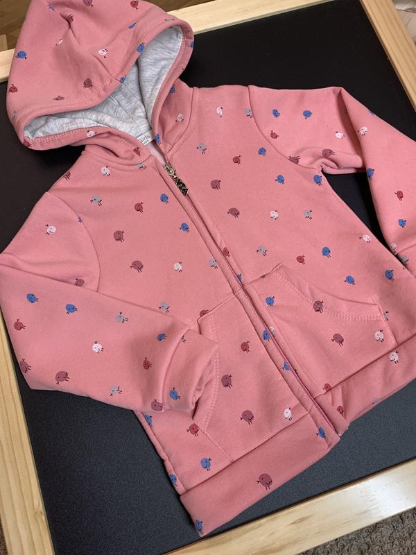 Ідеальна кофта на весну, для прогулянок! На флісі, діткам буде тепло. Капюшон теж утеплений. Ніжний колір, цікавий принт, з кишеньками. Є на 3,4,5 рочків