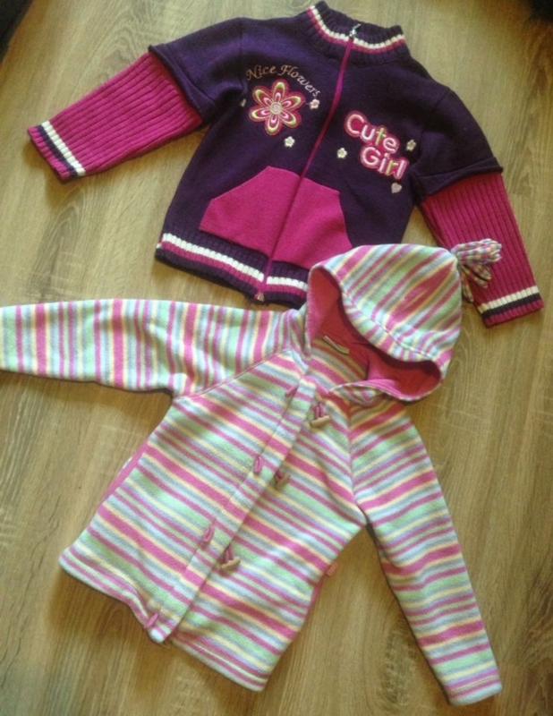Кофта фіолетово-рожева з кишенями на блискавці.Стан ідеальний .Дуже тепла і стильна.Розмір на 3-4 роки.Довжина 41 см,рукав-33 см,від плеча до плеча 30 див. Кофта в смужку з капюшоном плюшева на замку і з дерев'яними ґудзиками.Стан відмінний без дефектів і дірок.Розмір на 4-5 років.Спортивна кофта рожевого кольору з кишенями.Стан відмінний.З усіх питань пишіть або приїжджайте на примірку.Вартість вказана за одну.Дивіться інші лоти,відправка новою поштою після оплати на карту.