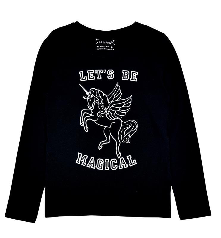 Удобный и стильный лонгслив на девочек от Primark. Лонгслив черного цвета с блестящим текстовым принтом и принтом единорога. Детский лонгслив из тонкого эластичного трикотажа отменного европейского качества. Практичная и универсальная модель прекрасно сочетается с брюками и юбками современных стильных девушек. Изделие сертифицировано международной системой тестирования текстильной одежды - Oeko-Tex Standard 100. Состав - 100% хлопок. В наличии есть размеры: 134 на 8 - 9 лет. Длина 52, ширина под руками 36, плечи 30, рукав 49. Цена 273 грн.