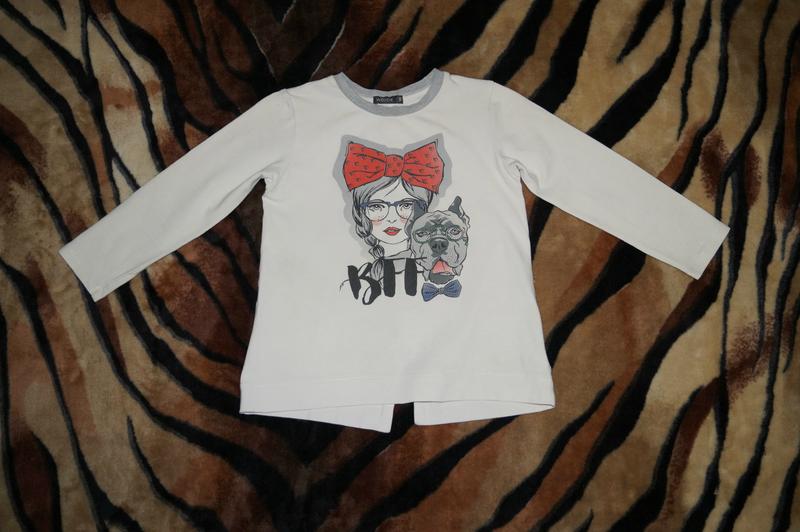 Модна кофта-туніка для дівчинки ТМ Wojcik. Розмір 122. Тканина: 92% бавовна, 8% еластан. Гарна кофточка молочного кольору. Має вільний крій і стильний розріз на спині. Лицьова сторона декорована стильним узором із зображенням дівчинки з собакою. Стан - дуже хороший (без нюансів), купували нової, носив тільки наша дитина. Заміри: Довжина по спинці 43 см ПОГ 33 см Довжина рукава 36 см