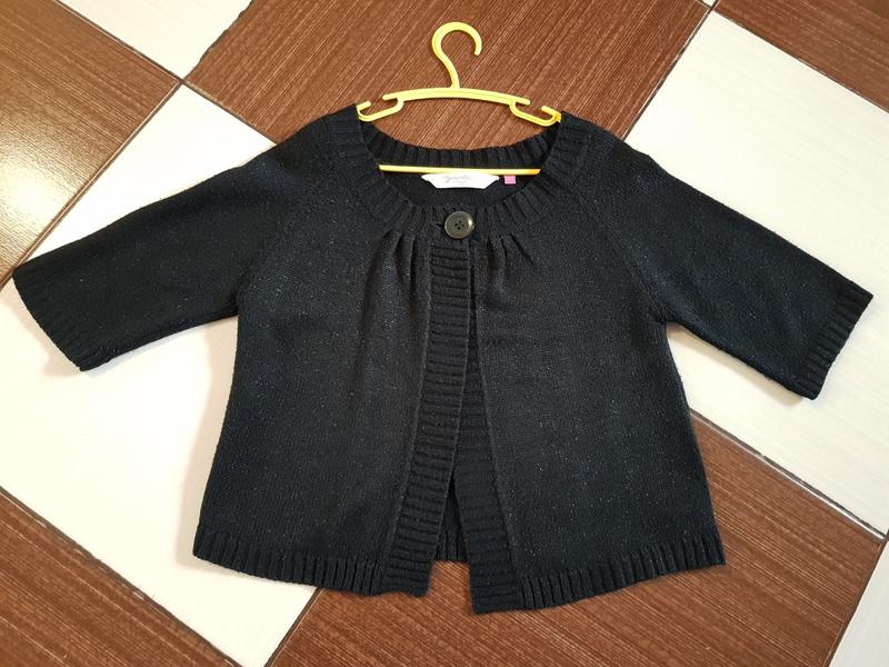 Чудова в'язана кофтинка чорного кольору (трохи з блистинкою) на зріст 152 см. Донька носила в школу зверху сарафанчика. Продаю, бо вже замала. Висота по спині 45 см. Склад 93% acrylic, 5% polyester, 2% metallised fibre.