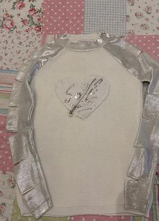 ошатна нова кофта або легкий светр,м'який і приємний тактильно з трикотажу-акрил з бавовною білосніжного кольору з сріблом,в центрі декоративне сердечко хутряне зі стразами і змійкою,рукави з розрізами,цікаво виглядає,без паперової бирки Туреччина Marions