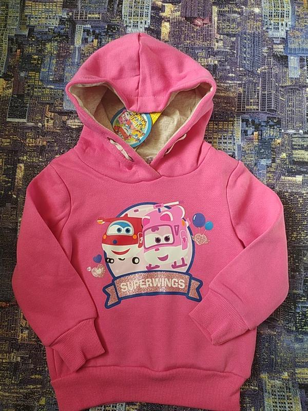 Капюшон на підкладці, всередині начіс. Спереду принт з блистками. Заміри 3/94 довжина 37,рукав 33, нот 31. 6/116 довжина 43, рукав 40, нот 35. Склад 65% поліестер, 35% бавовна.