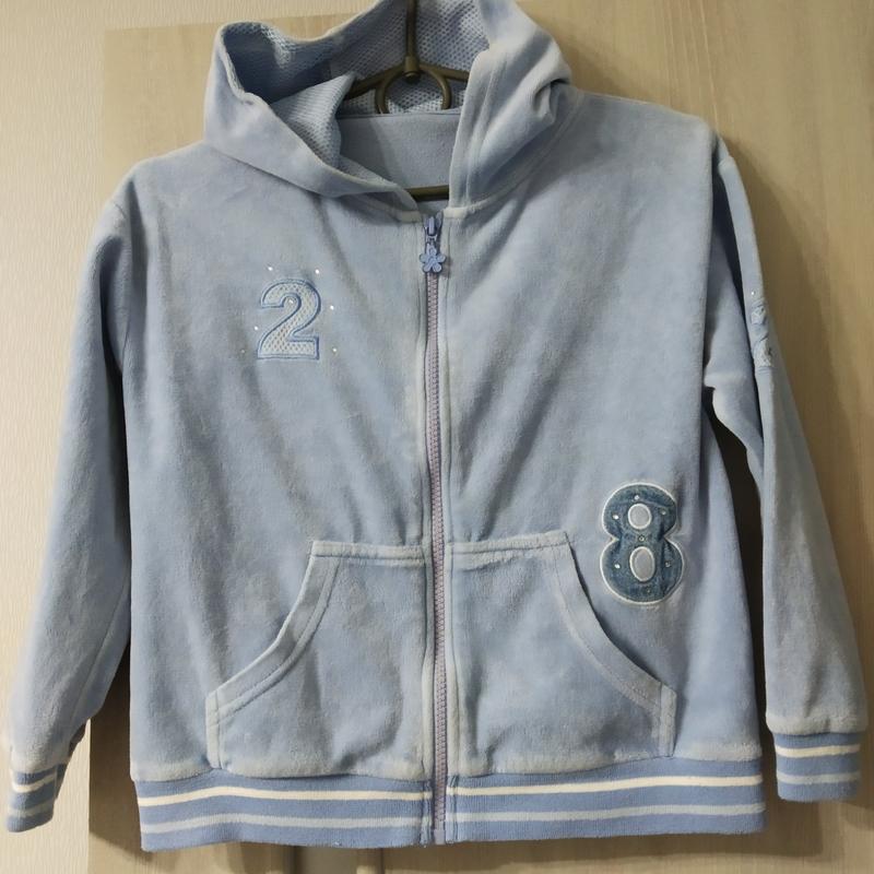 Кофта велюр блакитного кольору. Кофта з капюшоном, на блискавці. Тканина бавовна. Недолік - невелика пляма на манжеті рукава. Розмір на 8-9 років.