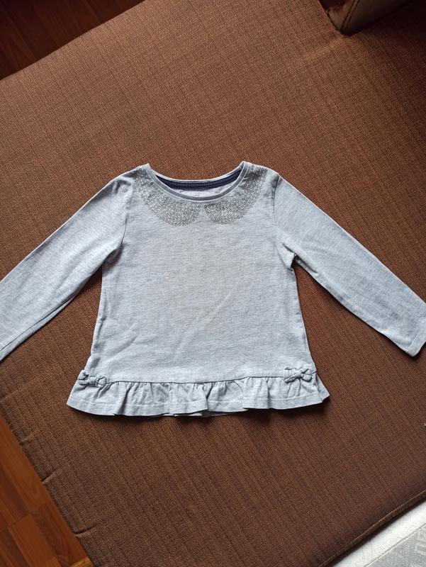 футболка для дівчинки,розкльошена донизу, дуже цікаво виглядає, з довгим рукавом, вік 2 роки, довжина 37,ПОГ 29 см, є поодинокі бліді плями.