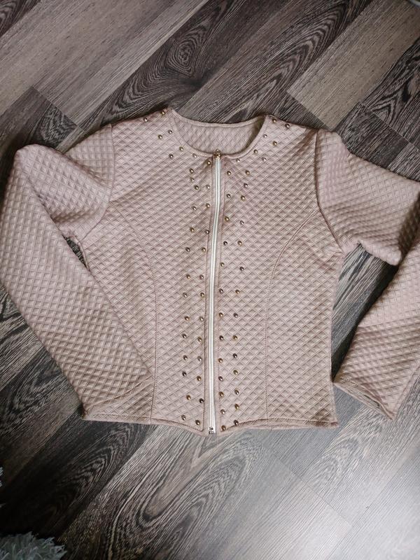 піджачок для дівчинки на замочку з намистинами, бусини надійно закріплені, колір сіро коричневий в стьоганий ромбик, довжина 45, довжина рукава 54