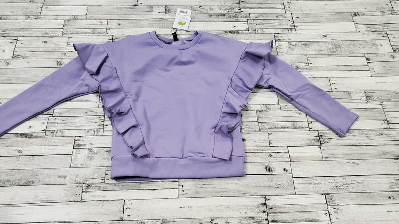 Свитшот нежного лилового цвета. Модель создана для девочек 7-14 лет. В ней школьница сможет отправиться на уроки или прогулку с друзьями. В декоре изделия использованы крупные рюши. Свитшот пошит из приятного к телу стрейчевого футера с начесом р.122-140 - 343грн р.146-158 - 398 р.122 (длина-45, рукав-49, по груди-35) р.128 (длина-48, рукав-53, по груди-35) р.134 (длина-48, рукав-57, по груди-37) р.140 (длина-48, рукав-60, по груди-38) р.146 (длина-51, рукав-62, по груди-40) р.152 (длина-53, рукав-64, по груди-42) р.158 (длина-56, рукав-66, по груди-44) Состав: 95%хлопок, 5%эластан