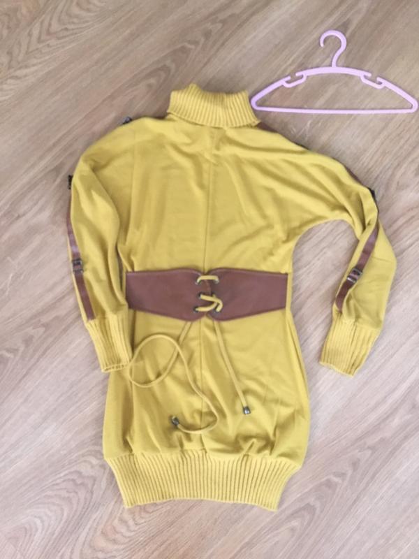 Розмір 152 Довжина 78 Довжина до початку поясу 35 Турція, трикотажна кофта-туніка, трикотажне плаття в ідеальному стані, одівалось всього 2 рази, без недоліків, гірчишного кольору з шкіряним поясом і лампасами на рукавах, рукав не відрізний, лампаси ідуть від горловини. Вживу дуже красиве, фото не передає колір, трохи темніше чим вийшло на 1 фото.