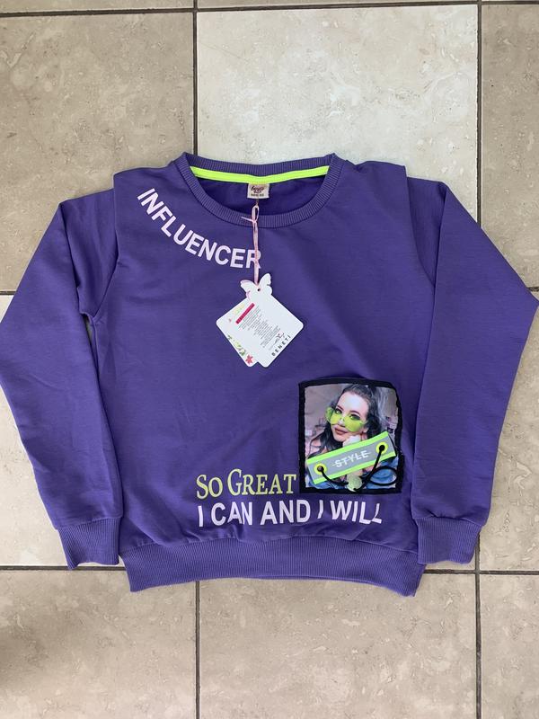 Світшот для дівчинки. Виробництво Туреччина. Заміри: розмір 140 - ін 52 см, довжина 51 см, пог 42 см, плечі 33 см; розмір 146 - ін 55 см, плечі 34 см, довжина 53 см, пог 43 см; розмір 152 - ін 40 см, плечі 35 см, довжина 55 см, пог 44 см; розмір 158 - ін 60 см, плечі 36 см, пог 45 см, довжина 57 см; розмір 164 - ін 63 см, плечі 36 см, довжина 59 см, пог 46 см