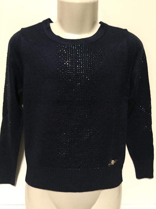 Очень нарядный свитерок для модницы темносинего цвета, впереди и на обоих рукавах отделан синими стразами, которые надежно припаяны и не отпадают при стирке, очень приятный к телу, отличного качества, производство Турция Размерный ряд 122,128,134,140 немного маломерит