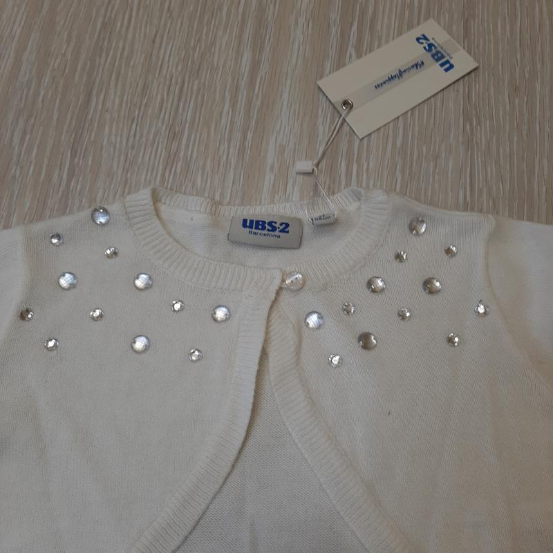 Болеро білого кольору з відтінком, з нашитими камінцями, зверху зашпиляється на один ґудзик ✔3 роки, зріст 98 см 💬50% котон, 50% акрил 🏷ubs2 Барселона