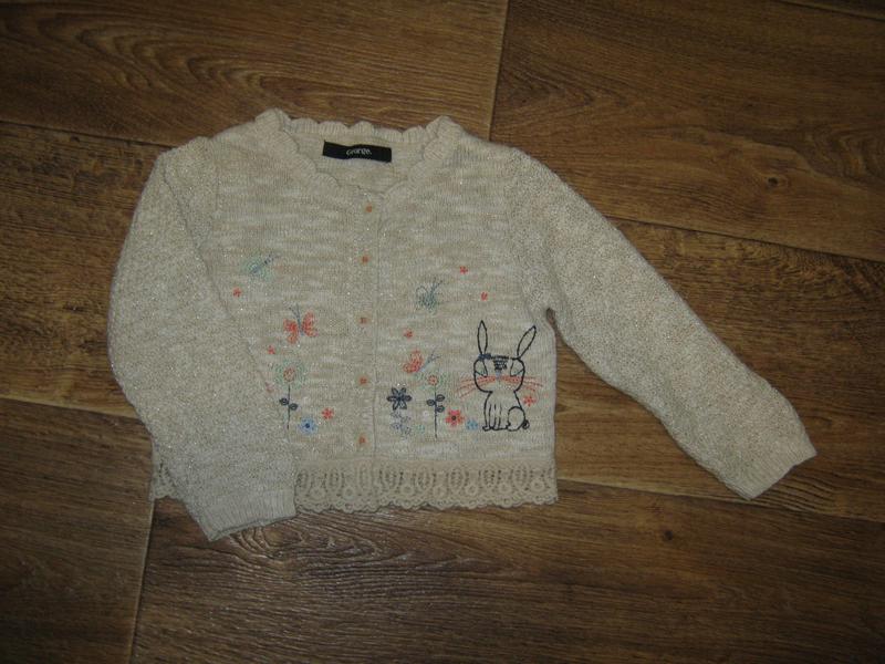кардиган на дівчинку 2-3 роки, у відмінному стані, довжина-28 см, ширина-29 см, довжина рукава від плеча-32 см від горловини-38 див. Обов'язково дивіться виміри і додаткові фото. Рекомендую дивитися всі оголошення,в наявності багато речей. Вдалих покупочек! ))) Склад: 94% бавовна, 4% поліестер, 2% метал.нитку.