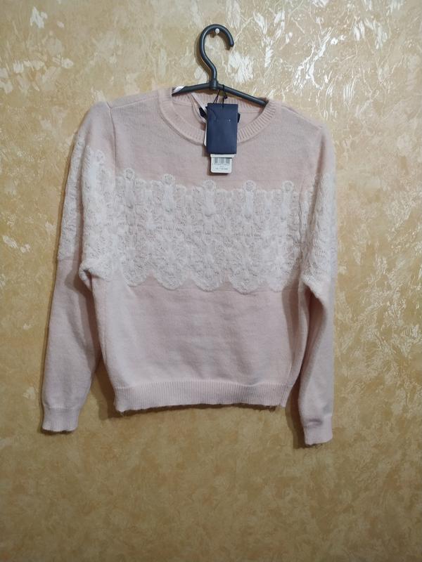 Теплий і м'який светр, ніжний пудровий колір. На рівні грудей прикрашений ажурною вузький білого кольору. Заміри: Ширина плечей - 35 см ПОГ - 48 см Довжина рукава - 60 см Довжина по спинці - 56 см