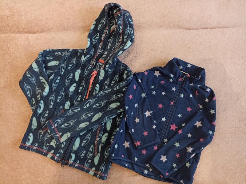 Флиски в очень хорошем состоянии для девочки. Синяя с капюшоном фирма Lupilu ,рост 110-116 (будет дольше)4-6 лет. Синяя в звёздочку, фирма H&M 110-116, 4-6лет. Замеры на фото. Стоимость одно 150 грн. Две отдам за 250.