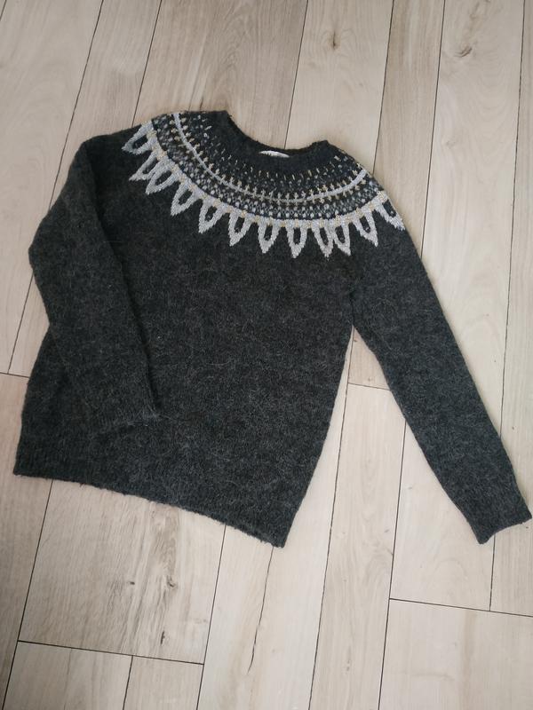 відмінна кофта з рукавом реглан, красива обробка, м'яка нитка, можливо буде лоскотати без майки. етикетка зрізана з складом, але в складі є вовна лами.