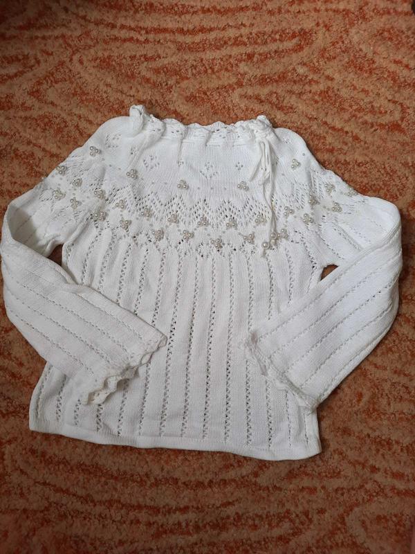 Продам свою кофточку, одета была 2 раза Цвет белоснежный Единственный нюанс, есть маленькие жёлтые пятнышка, от чего не могу понять, то ли от клея (хотя там бусинки пришиты) или от хранения(( На фотопоказала Смотрите все мои обьявление Экономьте на доставке