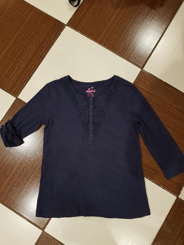 Чудова кофтинка на дівчинку темно-синього кольору на зріст 146-152 див. Купувала доньці в Німеччині. В ідеальному стані. Рукав 3/4, можна застібнути на ґудзик. Продаю, бо замала. Висота по спині 60 см, ПОГ 43 см, рукав по плечу 40 см ( по внутрішньому шву 28 см). Склад 100% cotton.