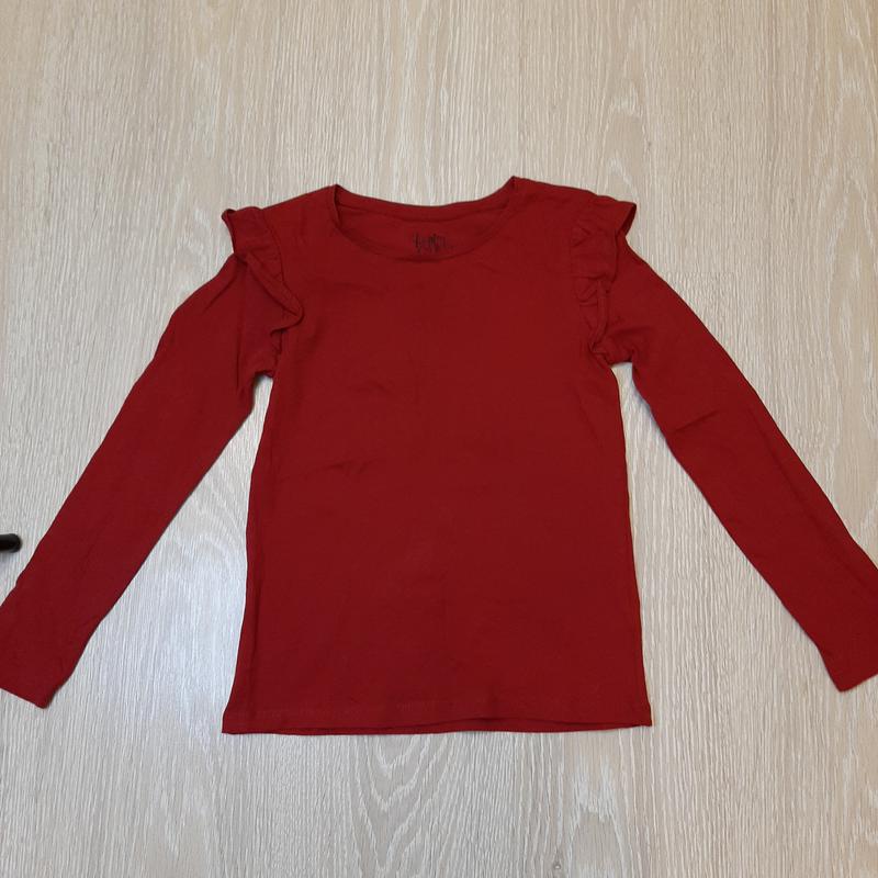 Реглан вишневого кольору, тоненький, на рукаві вгорі де плечі декоровано рюшами ✔вік 8-9 років, зріст 134 см півобхват грудей 33см, довжина рукава 47см, довжина по спині посерединівід плеча 46см/47,5 см, плечі 29см 💬100% котон 🏷c&a