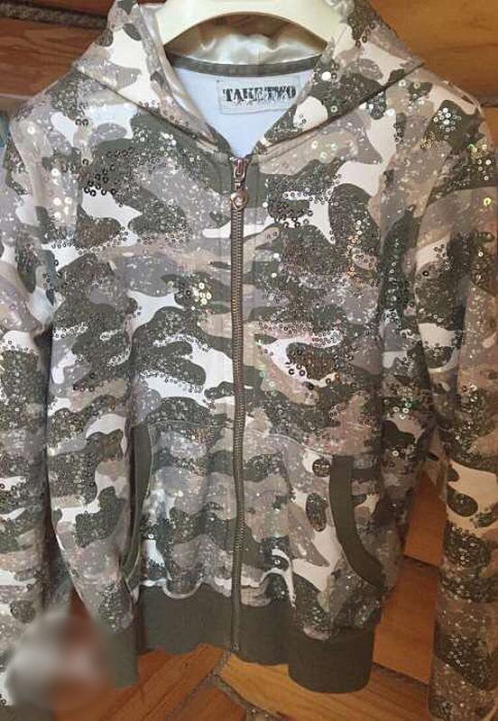 Гарна кофта для дівчаток 12 років. З паєтками і модним військовим принтів. Купувала в Італії.