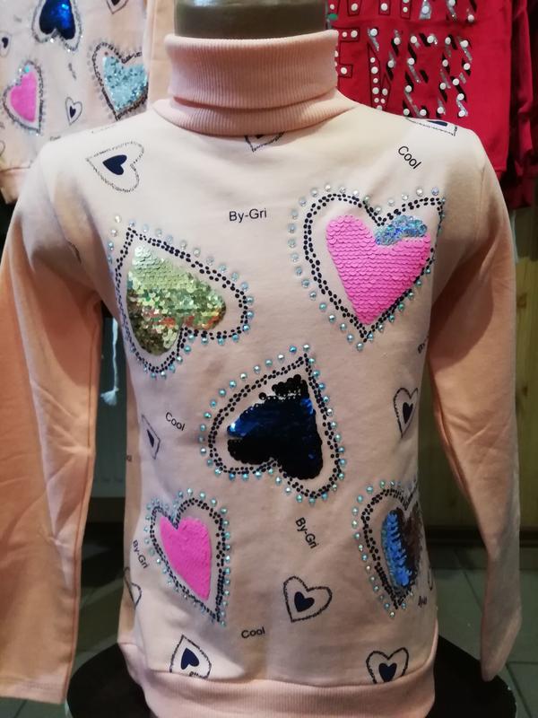 Кофта жіноча водолазка на легкій байку для дівчаток 5,6,7 років. Паєтки перевертиши💥🤩 110р: довжина 42, плечі 27, під пахвами 30, рукав від плеча 38 122р: довжина 47, плечі 29, під пахвами 31, рукав від плеча 43