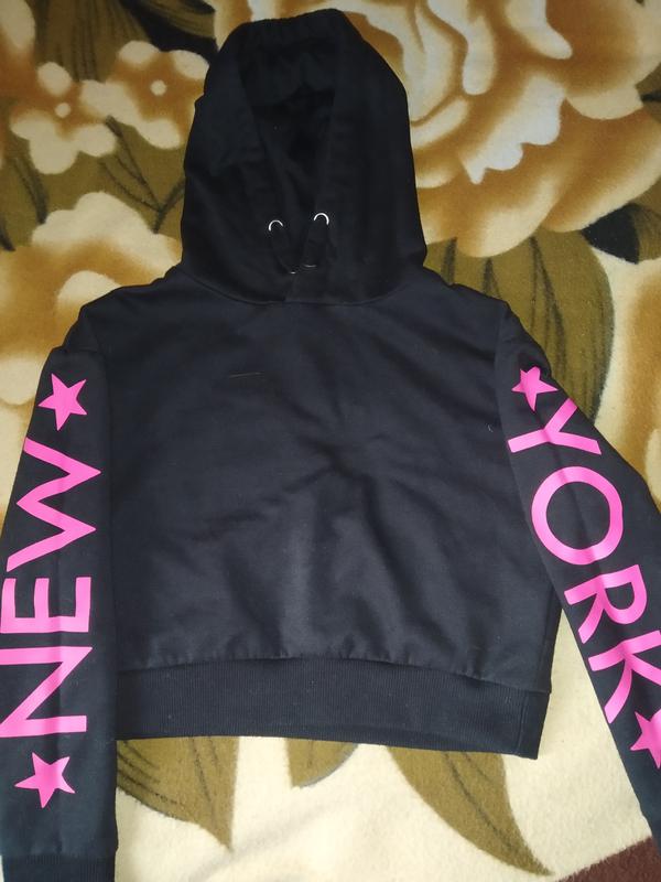 Укорочений худі з яскравим написом на рукавах на 7-8лет.Трохи утеплений.Стан відмінний. рукав 41 длина31 плечи40 груди 39