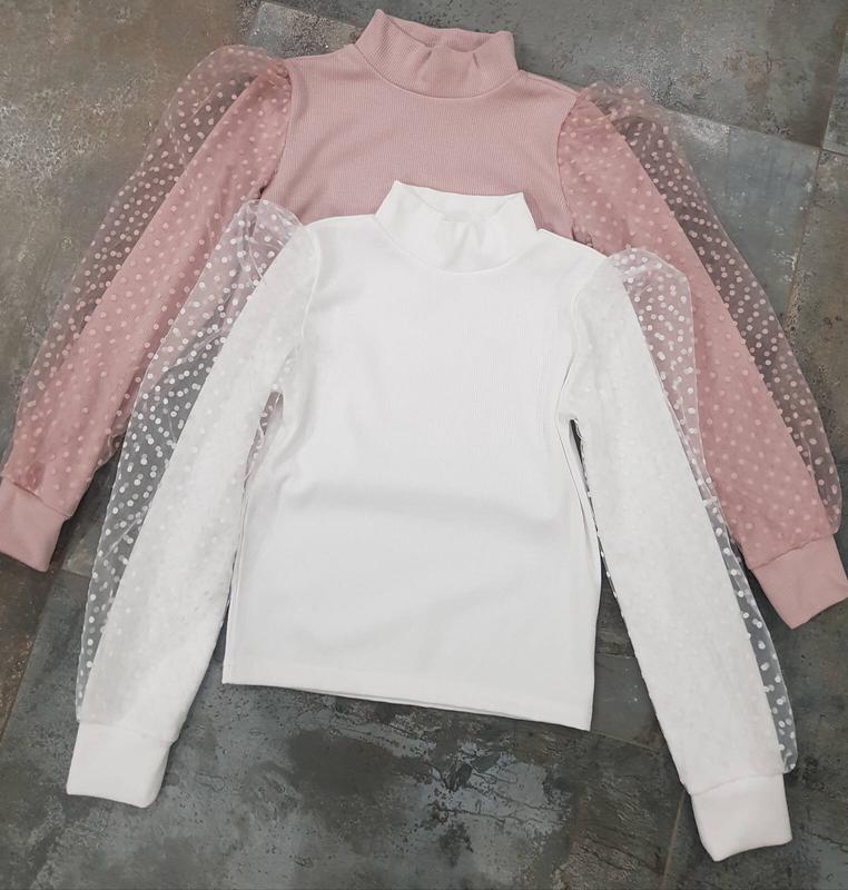 Ошатний гольфик для дівчинки. Рукава з широким манжетом, прикрашені сіточкою, горловина стійка. Гольфик пошитий з турецької тканини рубчик. Тканина приємна до тіла, добре тягнеться. Розмір: 128,134,140,146,152 зростання Матеріал: турецький рубчик + сіточка