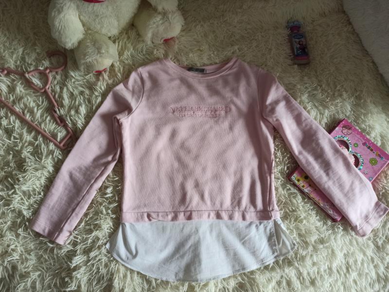 Кофта обманка рожева. Колір дуже ніжний, тканина натуральна. Написано на 11-12 років, але ми носили в дев'ять. Дивіться заміри. Довжина 56 Рукав 50 Ширина 42 Плечі 34 Стан нової