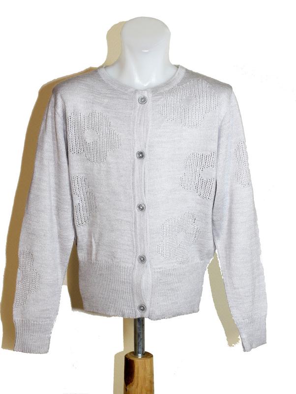 Кофта на девочку Кофточка на пуговицах. Отлично подойдет в садик или школу. Фасон на манжетах. Выполнена вязкой из мягкой тонкой нити, ажурной вязкой. Цвет: серый Состав: 50% шерсть, 50% акрил Размер: 122, 128, 134, 140