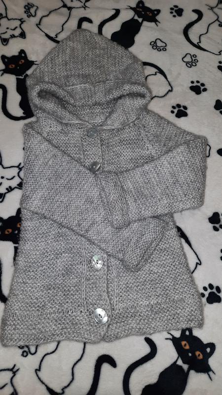Кардиган ручной работы. Состояние отличное . Очень незаменимая вещь в гардеробе, мягусенький. На девочку до 3 лет но носить можно гораздо раньше. Не растянут, стирался только в ручную.