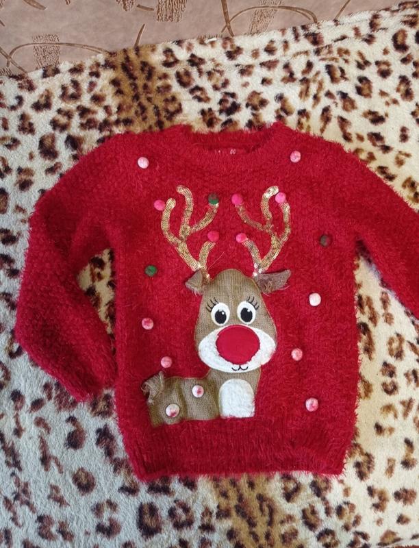 Продам шикарний новорічний сведрик фірми F&F по бірці на 6-7р,але буде і раніше, дивіться на заміри на фото.Стан супер з люрексовою ниткою,носик гарно світиться.Дуже крута кофточка.