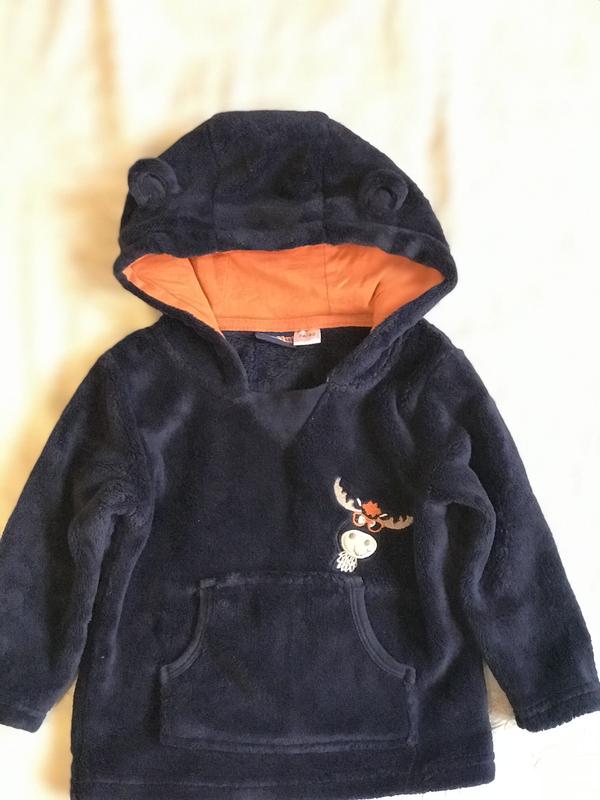 Джемпер дуже теплий. Lupilu. Унісекс. На шиї вставлена гумка. Темно-синього кольору, підкладка - оранжева. На капішоні - вушка. Розмір - 74-80. Пів обхват грудей - 30, рукав-28, довжина - 32.