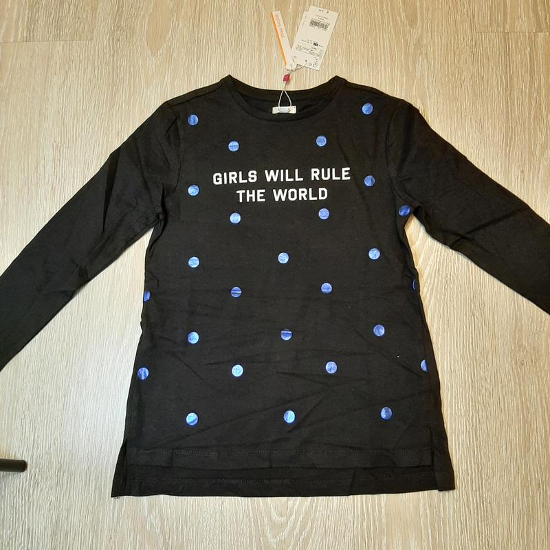 Кофта на довгий рукав, чорного кольору з ліпленням та принтом у синій з блискітками горох, ззаду подовжений на 3см ✔вік 10-11 років, зріст 146 см півобхват грудей 39 см, довжина від пахв і до низу 35/38,5 см, довжина рукава 48 см, плечі 34 см, довжина по спині посередині 57 см 💬 100% котон 🏷ovs