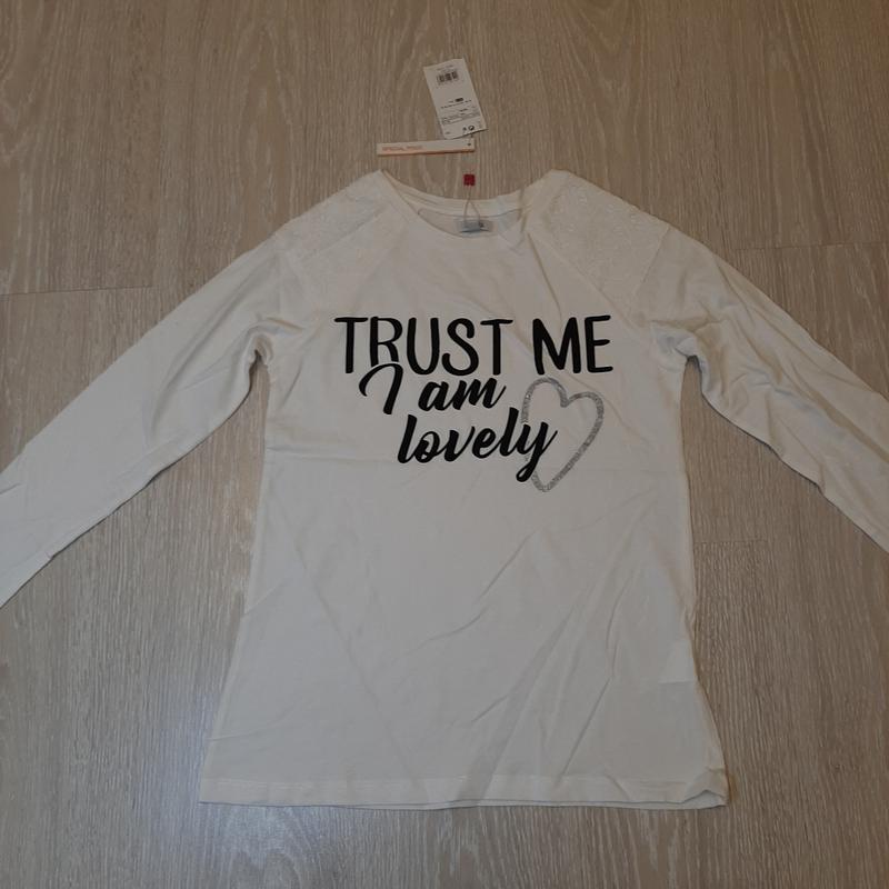 Реглан білого кольору, довгий рукав з принтом напис чорного кольору та глітерним елементом, на плечах вставки з гіпюру ✔вік13-14років, зріст 164 см півобхват грудей 40 см, довжина від пахв і до низу 40см, довжина рукава від шиї 63 см, довжина по спині посередині 58 см 💬 100% котон 🏷ovs