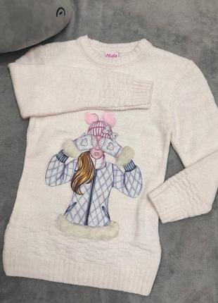 Светр туніка, на дівчинку 5-6 років, осінь-зима. Склад: 85% акрил 15% поліамід. М'яка на дотик тканина чудово тримає тепло. Не мнеться і не линяє. Зберігає форму довгий час. Погано вбирає вологу, тому придатне для повсякденного носіння. Після прання швидко сохне, не розтягуючись. Володіє хімічною стійкістю, тому відрізняться тривалою експлуатацією.