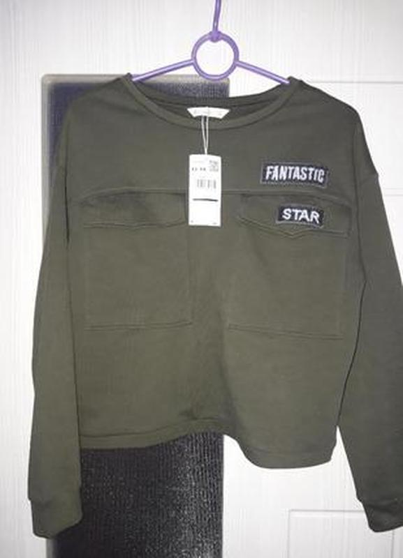 Оригінал. Світшот новий, куплений в Іспанії. В наявності р. 164,13-14 років за бирці. Колір хакі. З боків 2 кишені,над лівою кишенею красивий принт з паєток "Fantastic star". Склад: 100 % бавовна Заміри: довжина-52 см ширина ПОГ-49*2 см рукав від плеча-49 см по вн.шву-43 см