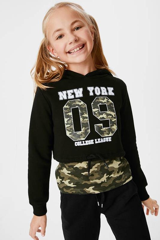 Комплект из худи и топа от C&A, Германия Отличное качество по отличной цене! Комплект, состоящий из худи укороченного кроя и топа. Худи из мягкого флиса с принтом и верхом из джерси. Цвет: черный/камуфляж. Размеры в наличии: 158/164. Цена окончательная.