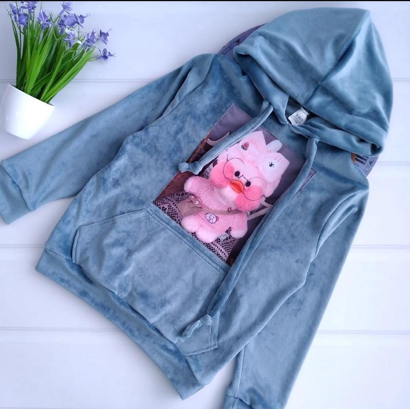 390 грн Весенний худи с любимой нашивкой Уточка Лалафанфан ⭐Ткань : велюр ⭐Цвет: серо-голубой ⭐Дополнительно: рисунок нашивка/карман кигуруми ⭐Производитель Украина ЗАМЕРЫ РУКАВА И ДЛИНЫ ОТ ГОРЛОВИНЫ р.134-длина от горловины 50 см /ПОГ 40 см/рукав 57 см-1шт