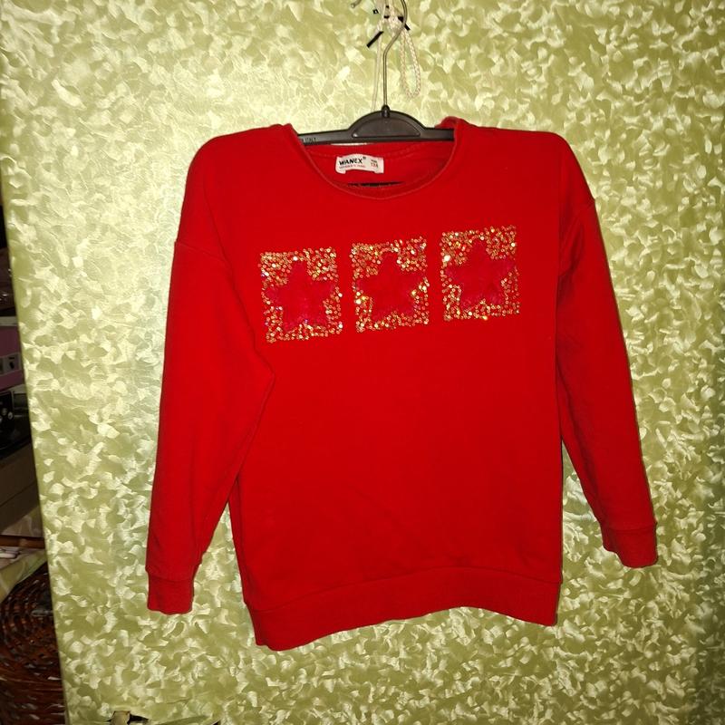 Батник для левочки яскраво-червоного кольору Туреччина 95%котону 5%эластан трезнитка на флисе,попереду рисунок з зірками і навколо них розшитий блискучими паєтками. длина 52см рукава36см ПО груди 38 см ПО бедра 38 см