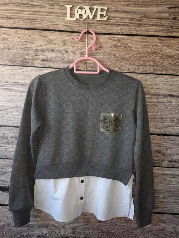 Серая кофта с вшитой рубашкой на девочку 10-11лет,в очень хорошем состоянии.Замеры:длина54см,полуобхват груди40см,длина рукава по внешней стороне53см,длина рукава по внутренней стороне 44 см.