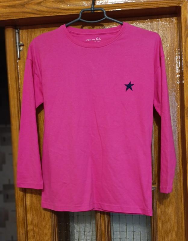 Колір: Насичений рожевий (фуксія). Лонгслів з круглим вирізом горловини. Декор: Невелика нашивка у формі темно-синьої зірки на грудях з правого боку. Матеріал: Бавовна Напис: На внутрішній етикетці біля горловини видно текст "under the stars". пише на 12 років 📏 довжина 61см довжина рукава від шиї 60см в грудях півобхват 46см