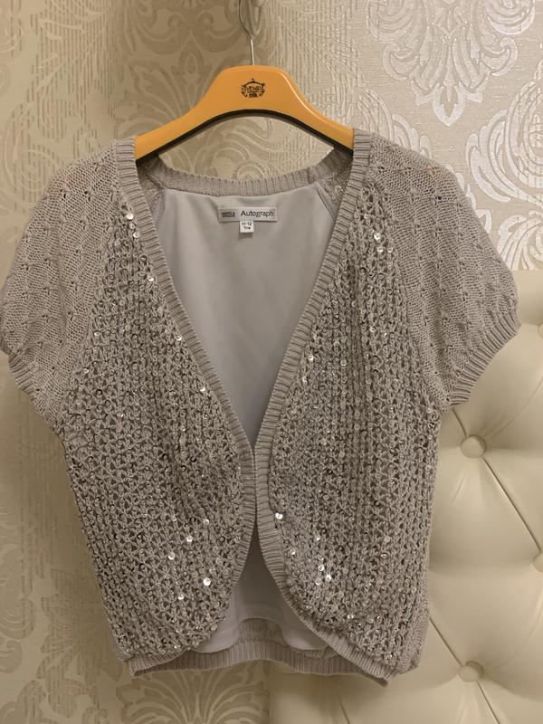 Красивая кофта-болеро Autograph Marks&Spenser для девочки 11-12 лет. 100% хлопок. Кофта на подкладке. Очень красивого серо-бежевого цвета. Спереди расшита пайетками и бисером. В отличном состоянии, в носке пару раз. Замеры по запросу. Обмен и возврат не предусмотрены.