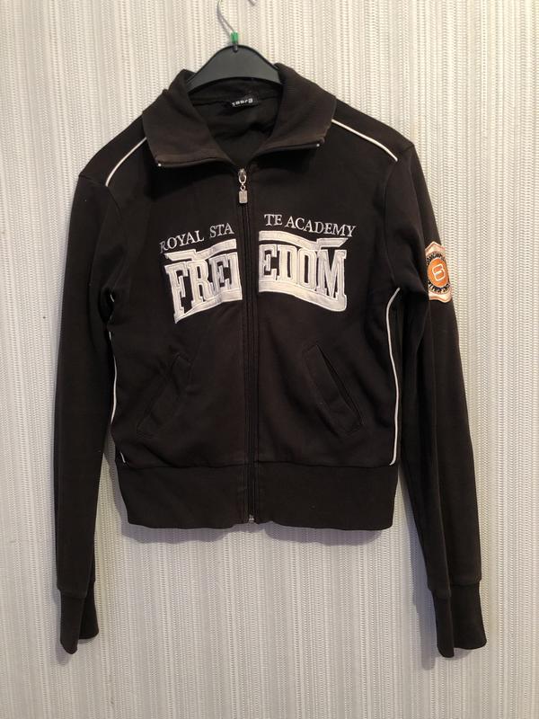 Чорна кофта на застібці,є кармани та вишитий логотип.На рукаві є значок.