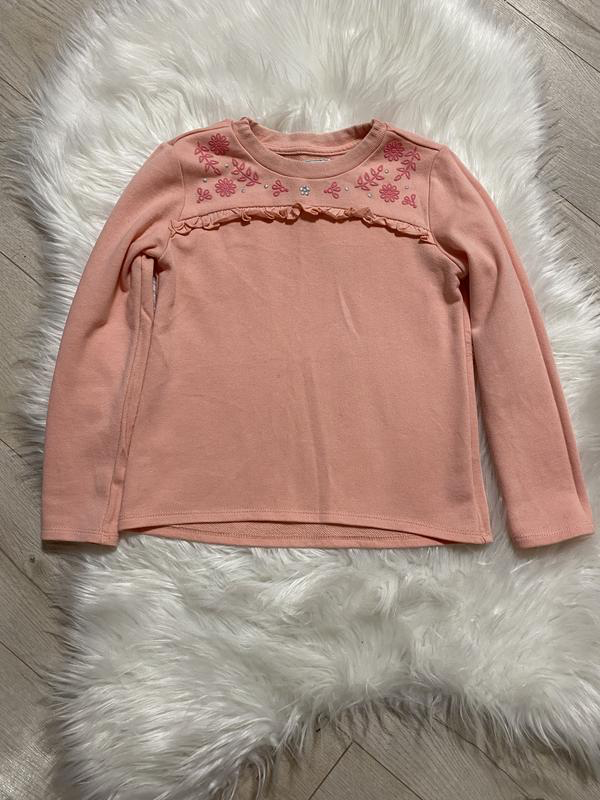 Фасон вільний Спереду декор рюшка і гумові візерунки -квітки Тягнеся Щільність середня Підійде на 6-8 років оріентуйтесь по замірам З нюансів -є маленькі плями на фото вказано у ціні враховано Довжина 46-48 см) Плечі 30,5 см) Рукав 47 см) Пог 38,5 см) Пот 38,5 см) Знизу 42 см) Продається так як є без притензій і без повернення