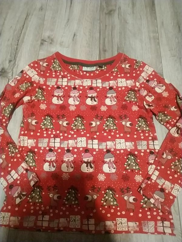 новорічний лонгслів, в чудовому стані по бірці 9 років, на зріст 134 см . довжина 50 см , рукав 49 см. під грудьми 40 см.