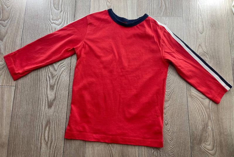 Лонгслив дитячий червоного кольору NEXT🛍️❤️🔥🥰🥰🥰 Розмір - на вік 3 роки/ на зріст 98 см. Склад : 100% бавовна. Виробник Бангладеш . Кофтинка з з нашивкою смужки біло - синього кольору віл вирізу шиї до краю рукава . Високий виріз горловини з синьою трикотажною резинкою. Трикотаж середньої щільності. Додаткові заміри : повна довжина 45 см, ширина плеч 28 см, довжина рукава 30 см , напівобхват грудей 33 см (повний обхват) 66 см, напівобхват талії 30 см (повний обхват 60 см), напівобхват стегон 32 см (повний обхват 64 см).