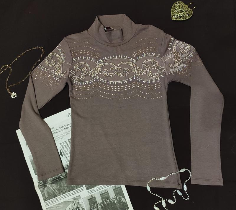 Кофтинка коричнево-сірого кольору (трохи з відтінком рожевого) на ріст 152 см. Розмір не зазначений, але параметри такі: Довжина (без горловини) - 52 см Довжина (з горловиною) - 57 см Довжина рукава - 53 см Ширина (або обхват грудей/талії) - 33 см Нова, проте помітила, що відпала 1 блискітка (на фото 6 видно чорну точку). Дуже м'яка та ніжна тканина на дотик.