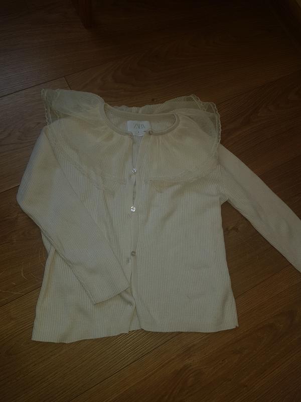 Кофтинка на гудзиках,молочного кольору. Воротник оформлений дуже красиво. Підійде на зріст 142-146 см