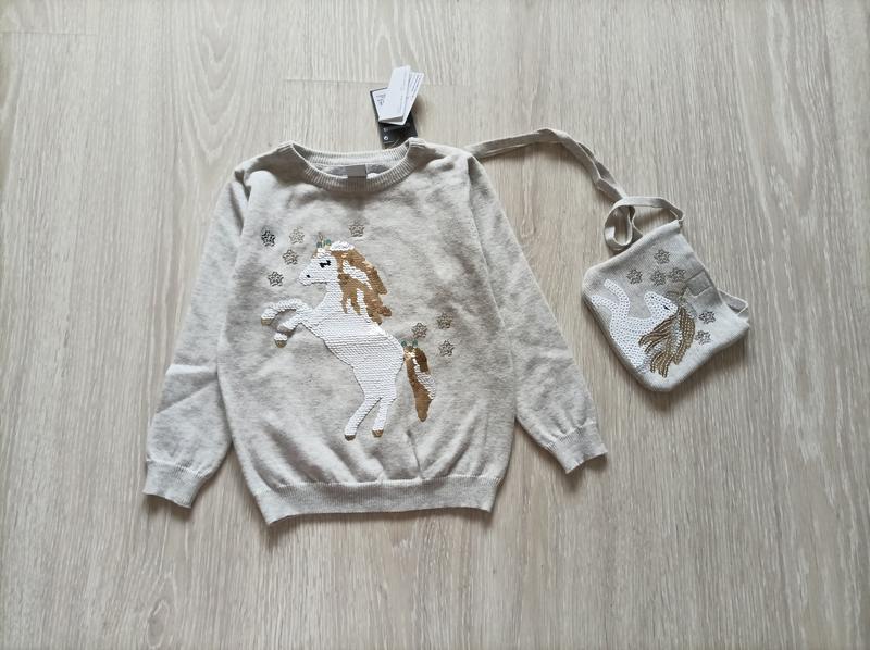 класна нарядна кофтинка з єдинорожкою від улюбленого бренду Primark сумочка в комплекті легка тканина нагадує ангору паєтки перевертаються ідеальний варіант на свято і на кожен день розміри 3-4 5-6