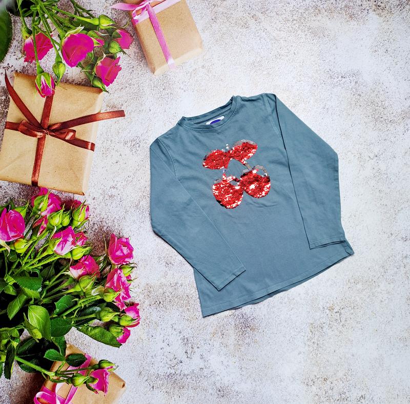 Зелений реглан з вишнями паєтками на 6 років Шир 30,довж 43,рукав 38