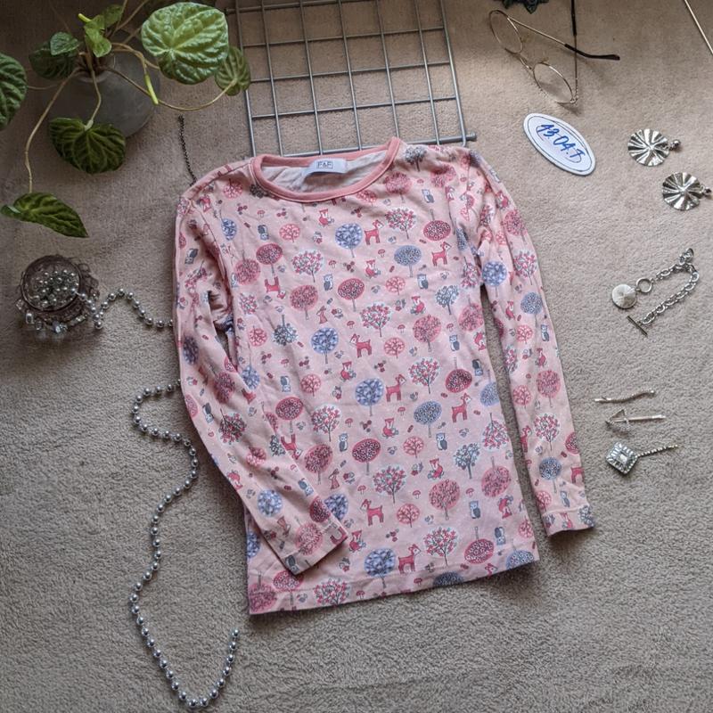 рожевий реглан з лісовими принтами фірма f&f 4-5 років ззаду є 5 см пропуск шва інших дефектів немає По грудей 33 41 під руками довжина рукава від плеча 36 довжина виробу по спинці 42 ( якість дуже хороша )